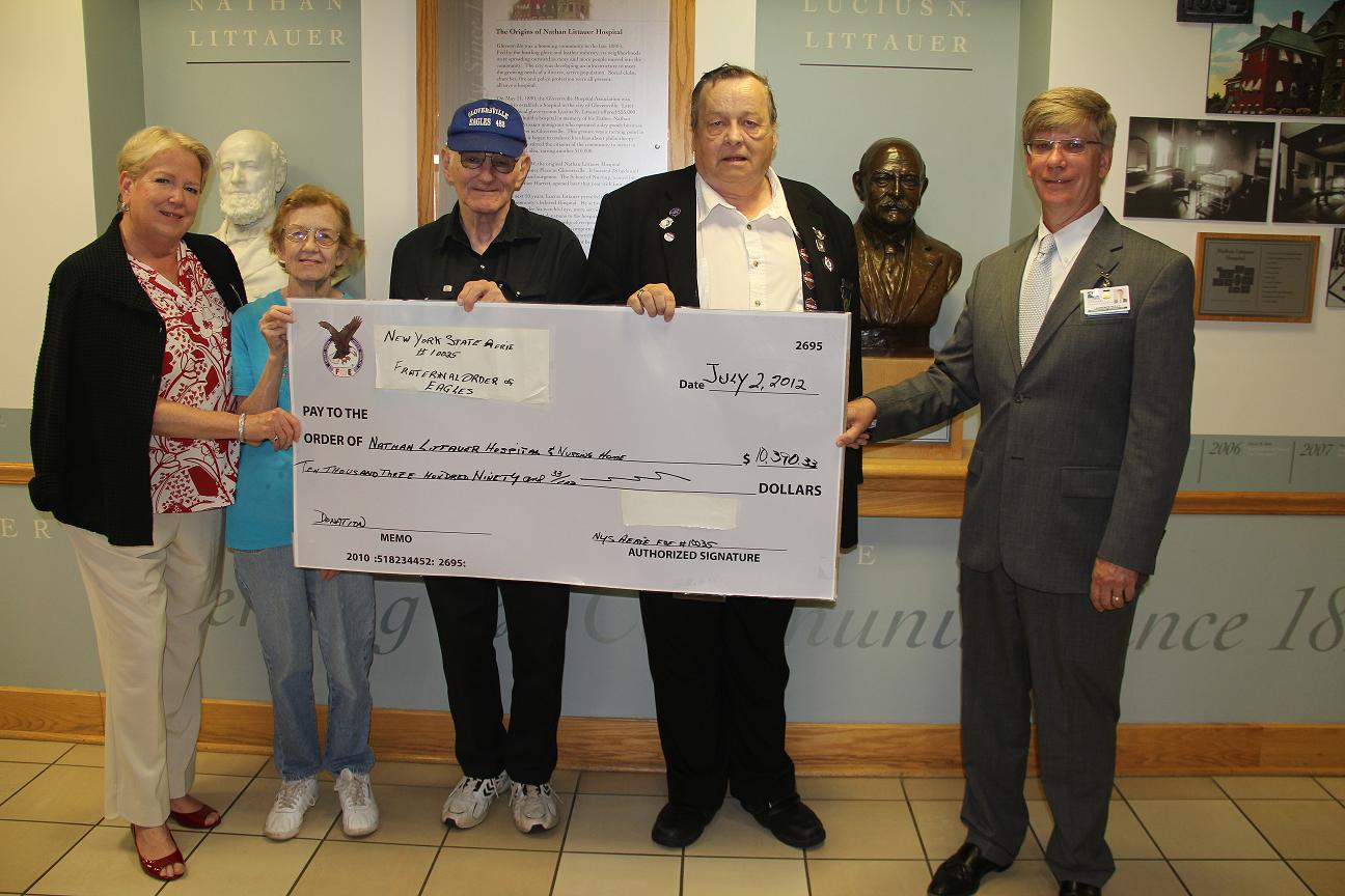Nathan Littauer Received “generous gift” from Fraternal Order of Eagles Posted on September 26, 2012October 3, 2012 by Dakota PikeFrom Left to Right: Susan Kiernan, Vice President of Development for Nathan Littauer Hospital and Nursing Home; Maureen Phelps, State Trustee for the Fraternal Order of Eagles, Harry Phelps, State Trustee for the Fraternal Order of Eagles, David F. Cook, State President for the Fraternal Order of Eagles, Laurence E. Kelly, Hospital President and CEO of Nathan Littauer Hospital and Nursing Home.Recently David Cook, State President of the New York State Fraternal Order of the Eagles presented a check representing $10,390.33 worth of donations made to Littauer over recent months. “The Eagles have always been very kind to Littauer, particularly our Nursing Home.” stated Susan Kiernan Hospital Vice President of Development. She added, “We are very grateful for their generous gifts and continued support.”The Fraternal Order of Eagles, founded in 1898 in Seattle, Washington has a local aerie in Johnstown.From Left to Right: Susan Kiernan, Vice President of Development for Nathan Littauer Hospital and Nursing Home; Maureen Phelps, State Trustee for the Fraternal Order of Eagles, Harry Phelps, State Trustee for the Fraternal Order of Eagles, David F. Cook, State President for the Fraternal Order of Eagles, Laurence E. Kelly, Hospital President and CEO of Nathan Littauer Hospital and Nursing Home.